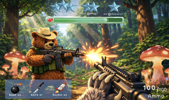 CONCEPT: Digital first-person shooter game played on computers for individuals aged 10 and up. The game follows a domination “story” in a fantasy setting, where players are animals of different classes wielding various types of guns (bear, moose, fox, hawk, elephant, etc). The aim of the game is the team that gets the most kills wins, and teams are free to choose which animals would work best together in order to defeat the other team. There are multiple maps that the battles take place in, including a funky forest, dustiest desert, and a mystical mountain valley.